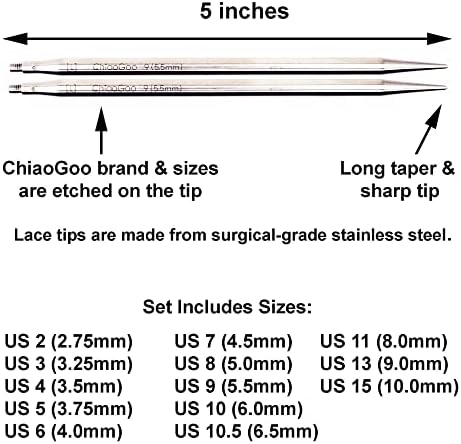 This ChiaoGoo Twist Red Lace Interchangeable Circular Knitting Needle Set includes 13 needle sizes (US 2-15, Metric 2.75-10mm) and comes with a convenient craft project bag (13×16 inches) for easy storage and portability. The set features 6 cable lengths (14″, 22″, and 30″) and a variety of accessories such as cable connectors, end stoppers, stitch markers, cord keys, and a needle gauge. Perfect for knitters on the go, it keeps everything organized in a handy cloth carry case. All accessories are conveniently stored in the front zippered pocket.