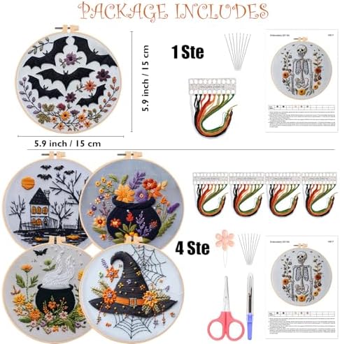 Complete Halloween embroidery kit: Includes 6-inch hoop, needles, colorful threads, threader, thimble, and instructions—perfect for beginners to create Halloween crafts