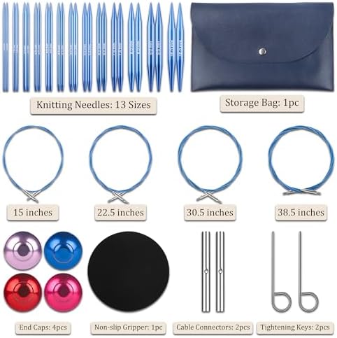 This complete knitting tool set includes 13 pairs of aluminum circular knitting needles (3.0–10.0 mm), four cables in varying lengths, and essential accessories like end caps, cable keys, and couplers—all neatly stored in a leather pouch. The smooth, durable needles feature engraved size markings and ergonomic, lightweight handles for comfortable, fatigue-free knitting. Interchangeable and versatile, this set is perfect for all skill levels and makes an excellent gift for any knitting enthusiast.