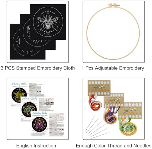 This beginner-friendly embroidery kit features three tarot-inspired patterns—moon, butterfly, bee, and moth—designed to help you learn various techniques. The full set includes pre-printed water-soluble fabric, a 7.9″ hoop, colorful threads, needles, and detailed English instructions.